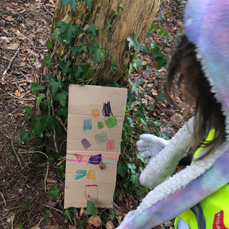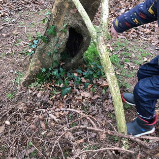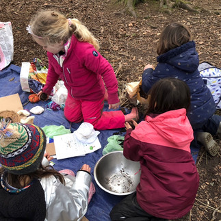 We gathered in a circle and introduced ourselves with our favorite animals and their movements. Even if it is cold, children love spending time in the woods. The woodland looks so different from any other season. The trees are bare, the ground is frozen, and the air is cold and fresh and you feel the warmth of your body and breath. Spending time in the woods all year around gives children the sense of nature's cycle and the turning of the seasons, different sensations and a resilient and healthy body. Our aim is to give the children opportunities to experience this. We believe that nature is so important for their healthy development. Once our bodies were warmed up, we moved to our base camp, where we will spend the rest of our Forest School this term. When we arrived, we shared the forest golden rules (keep ourselves, each other, and nature safe and happy). Also we set clear boundaries where the children can spend time freely and safely. It is very important to give the children the sense of responsibility to keep everyone, including themselves safe in the natural environment. Then we found a letter from a grandmother tree. She knew all the children’s names, which were told by the fairies. We asked the children if they had seen the fairies, and lots of them said "yes!" "I have seen them in my garden!" "I can see them now!" So we looked around our basecamp to see if we could find any fairy homes, and some of the children enjoyed making fairy doors. Some other children started digging holes on the ground and trying to find something interesting. Some of them wanted to make fairy homes in the ground, Because it is "nice and cozy down there!" Some of the children loved investigating what’s in the soil and found the dead barks and big rocks hidden underneath the ground. Some others tried helping put up the rope swings on a tree. The important Ethos Forest School is child-led play. So we would introduce the activities each week, but if the children have ideas, we let them lead the sessions. There are no right and wrong as long as they are keeping the golden rules. So that the children can make their own trial and error, and they will gain their confidence in their judgment, and self belief. In the natural environment, children use their imaginations and creativity to make spontaneous fun.