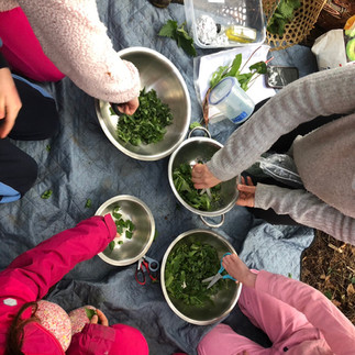 It is a great season for foraging some edible plants from the forest. We would pick only the plants which are abundant in the area. Even if they are abundant, they might be a very important food source for other animals, so we just pick a few. So the children picked some nettles and wild garlic / three cornered leeks. They helped chop the nettles using scissors, and mixed them with olive oil, pine nuts and salts. We tried tasting with crackers - some liked it and some didn't!